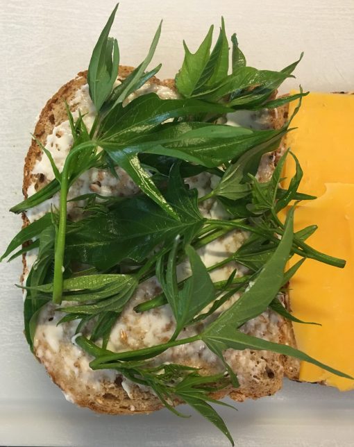 Today I pulled out 7-1/2 pounds of ‘uala, or sweet potatoes, of various shapes and sizes from the semi-circular patch out front. At the same time I plucked and saved the edible tender sweet potato leaf shoots. I rinsed and dried the greens and reserved them for sandwiches and salads.