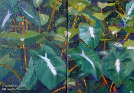 DH and I will have time to attend the First Birthday Luau for Eva and Kingston, girl-and-boy twins, who live down the highway. Special family friends too, so a very special gift is in order—my Kalo Diptych. Shh, it’s a surprise!
