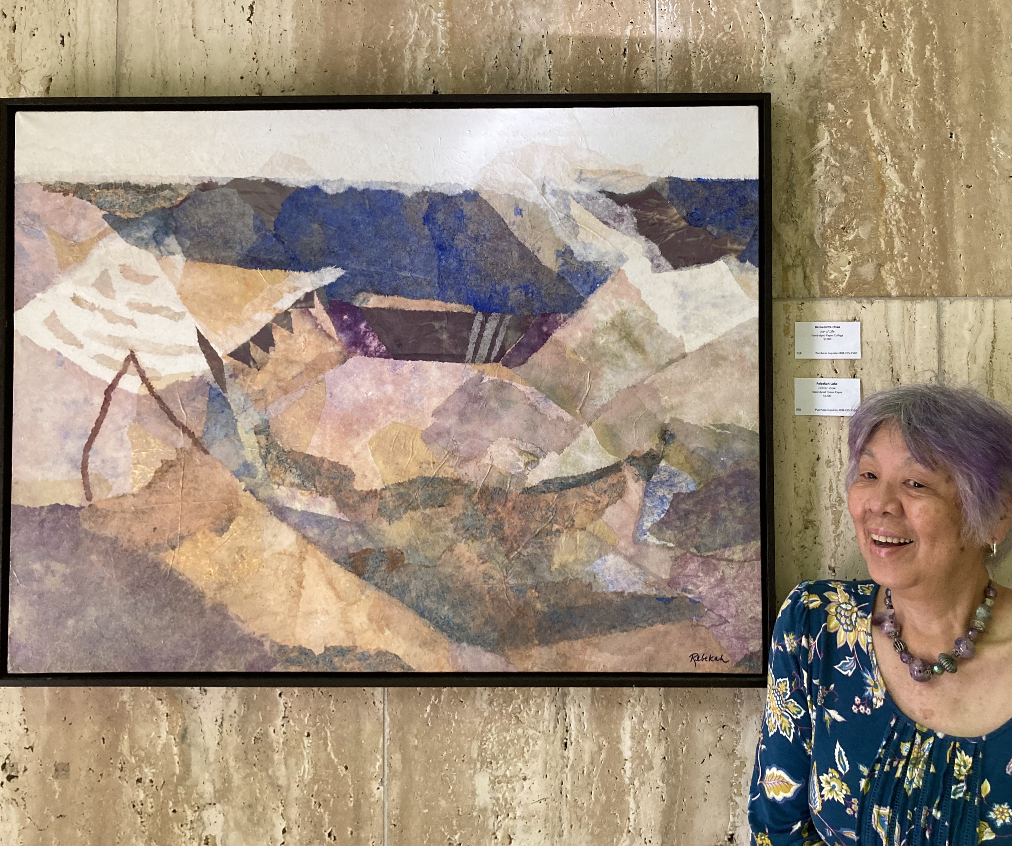I appreciated very much the words of Gregory Pai, the juror of Ultra III exhibit of the Windward Artists Guild. He gave the remarks on March 16, 2023, about my hand-dyed tissue-paper collage entitled “Crater View.” The actual crater at Kilauea was Fissure 8, now named ʻAhuʻailaʻau. The acoustics were poor in the second-floor lobby of Pauahi Tower, where the art will be hanging for two months, so I hope I heard the video correctly for my transcription: